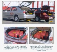 “Амулет” лишь с виду классический седан, а на самом деле удачно замаскированный хэтч-бек. Главная ваша забота – справиться с тяжеленной – из чугуна ее, что ли, отливали? – пятой дверью. Зато завершив силовой подход, в награду получаете доступ к огромному багажному проему. Так что, убрав с глаз долой диван (у него, кстати, складываются как спинка, так и подушка), освободите погрузочную платформу, достойную иных компактвэнов. Да и объем багажника повергает в трепет – минимум 550 л и полтора кубометра при сложенном диване! Правда, впечатление портит подштамповка под “запаску”, возвышающаяся аккурат по центру багажника.